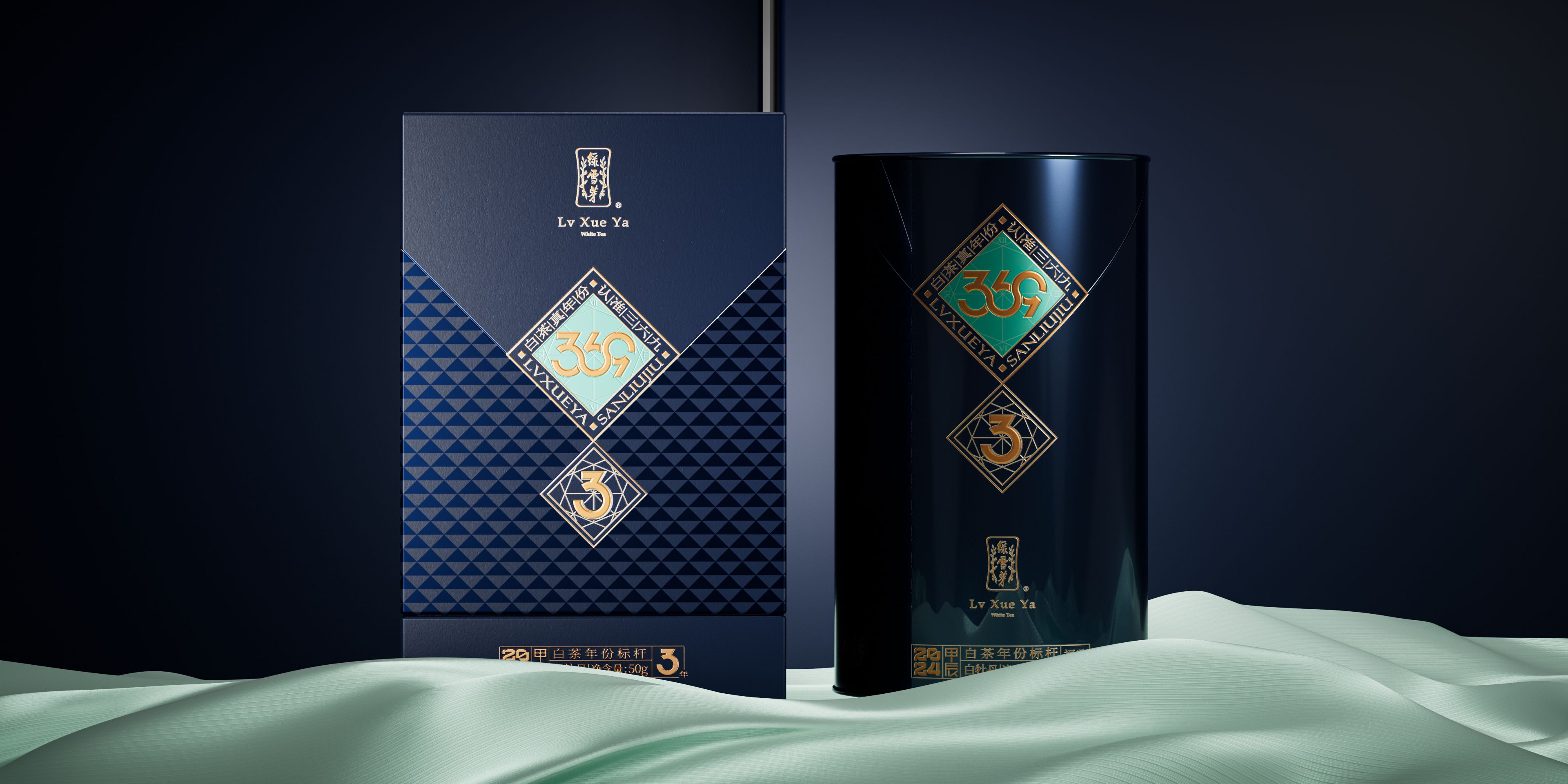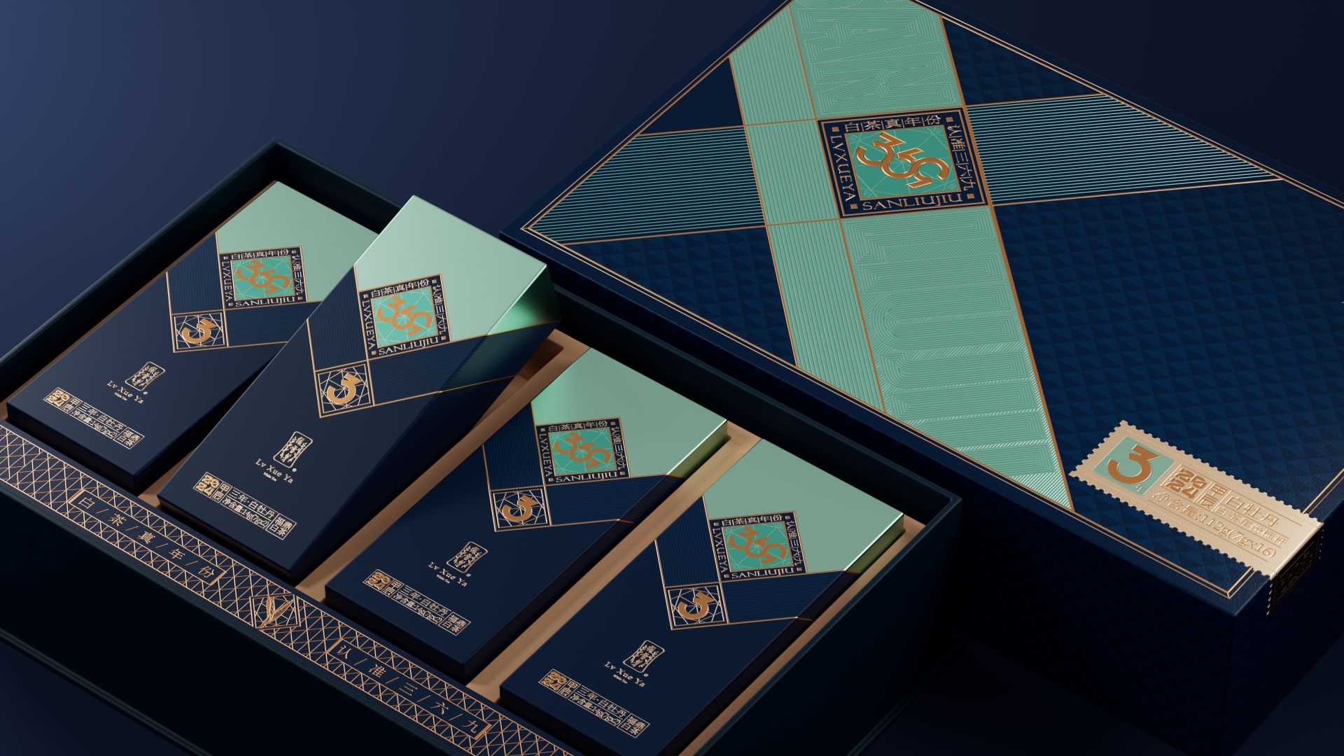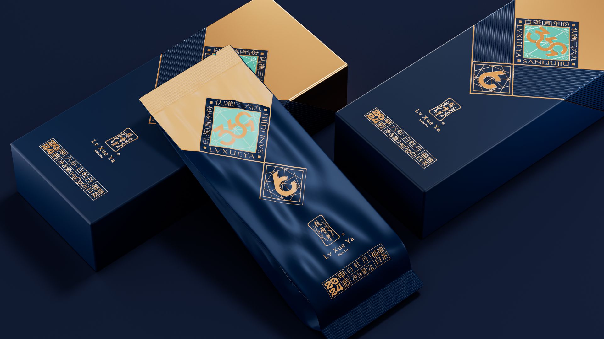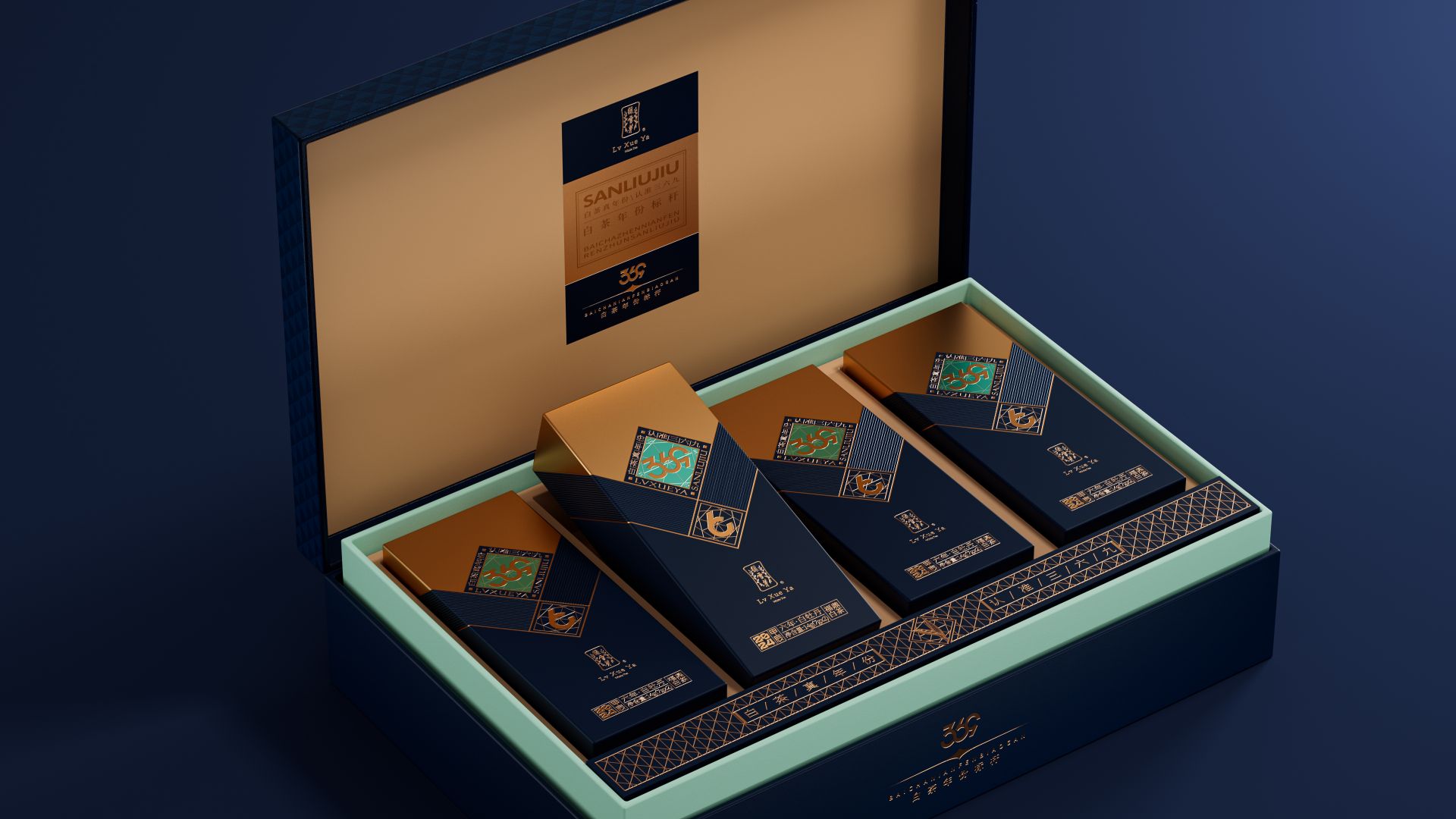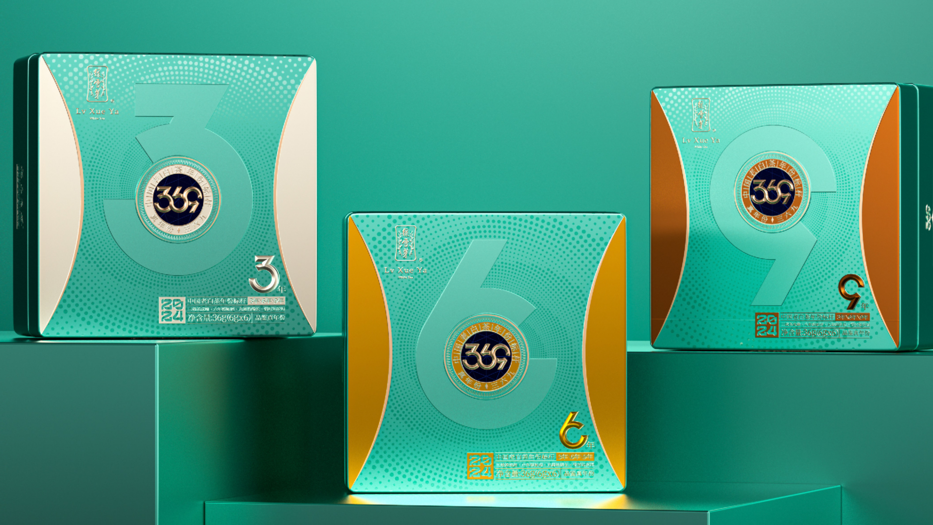 我们为绿雪芽精心打造出一款在现代语境下具有划时代意义的包装。369系列是绿雪芽首创老白茶3年、6年、9年的年份标杆。盒面运用现代极简设计,直观表达数字符号,在品牌蓝的衬托下更加耀眼。每一个数字都仿佛有生命,诉说着白茶历经3、6、9 年的沉淀与凝练。字形设计巧妙借助数字的线性相似处与印章的几何图纹相组合,来表达光阴的意涵。那古朴的印章形态和细腻纹理,如同庄重的守护者,是时间的纪年,更是岁月的鉴证。它如同一份被加盖时间印记的宝藏,等待着懂它的人去开启、去品味。