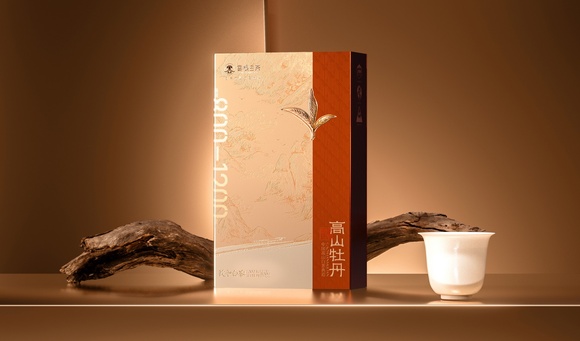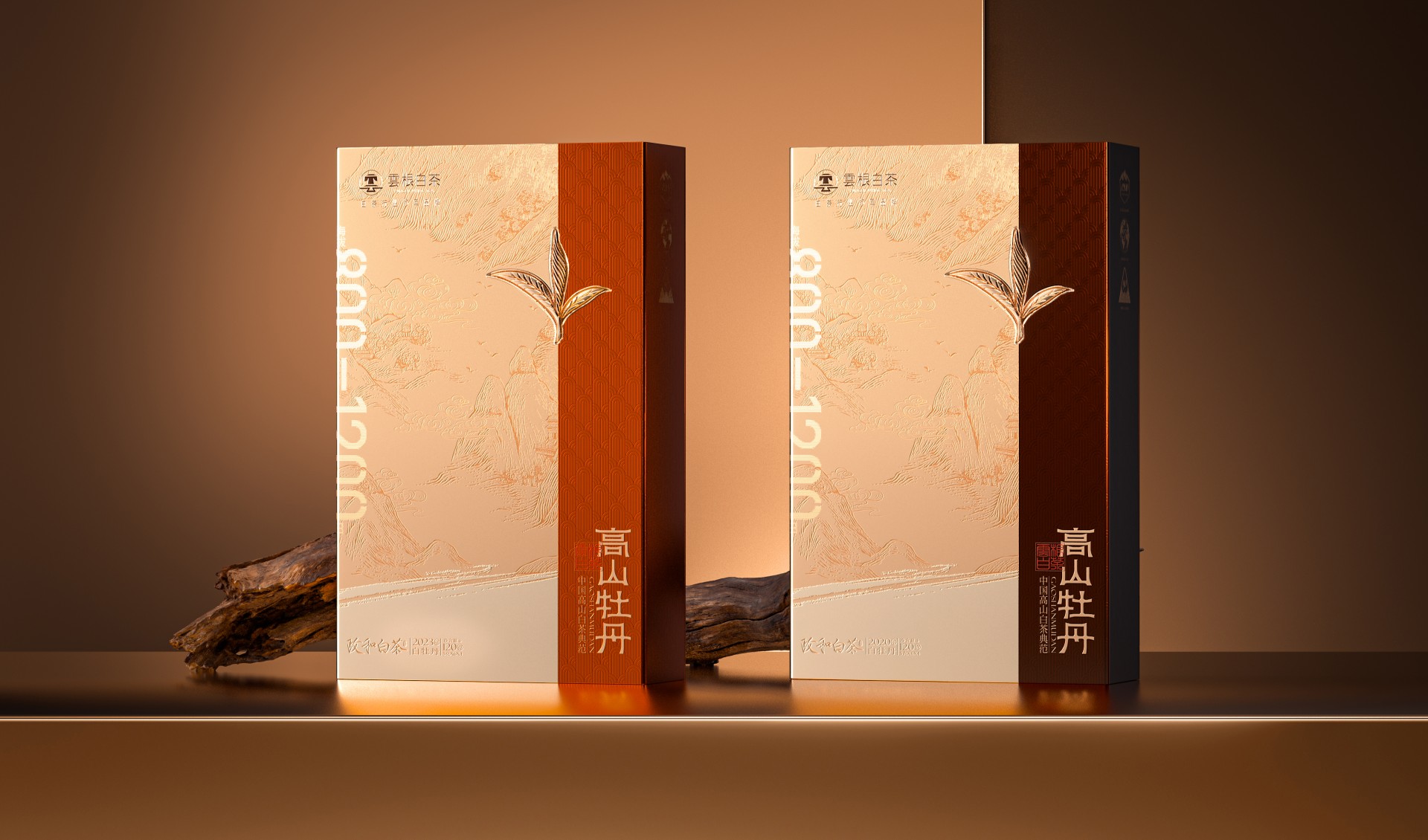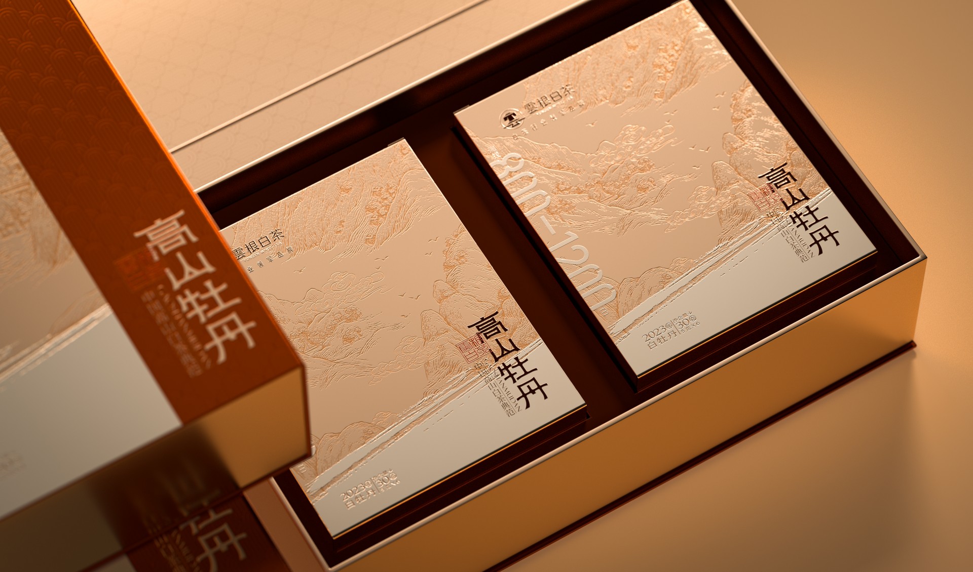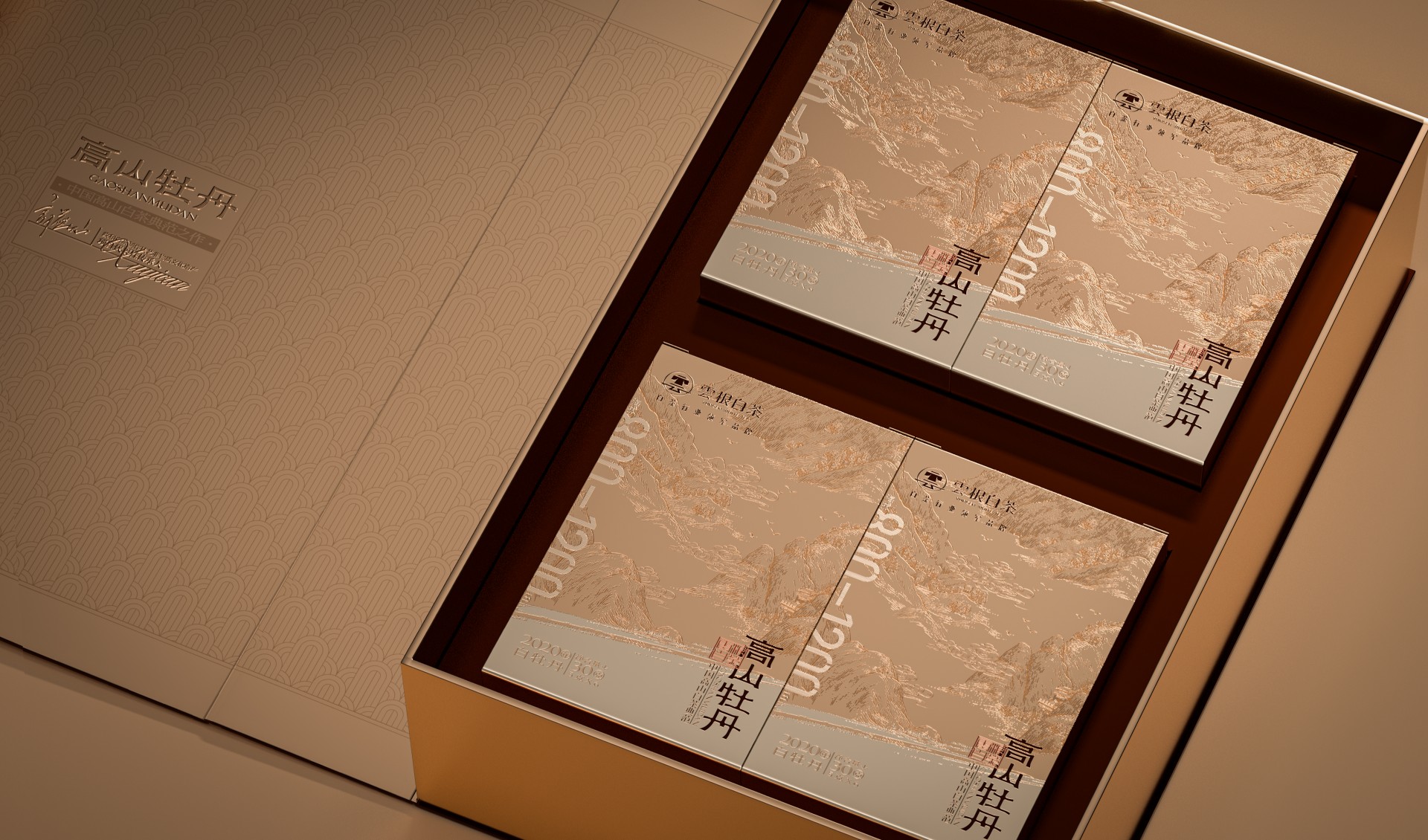 将山水覆以平面化表达,通过奇峰、雁群、青山等元素,动静交织,重现空灵磅礴。用精致细腻的线条勾勒出光影的诗篇,洒落于香槟盒面,与温暖的光线碰撞,迸发出独特的质感。创意使用立体茶叶设计,于三维空间延伸立体诗画空间。在举杯换盏的间隙,对话高山灵魄,品味高山牡丹不凡的品质与风骨。