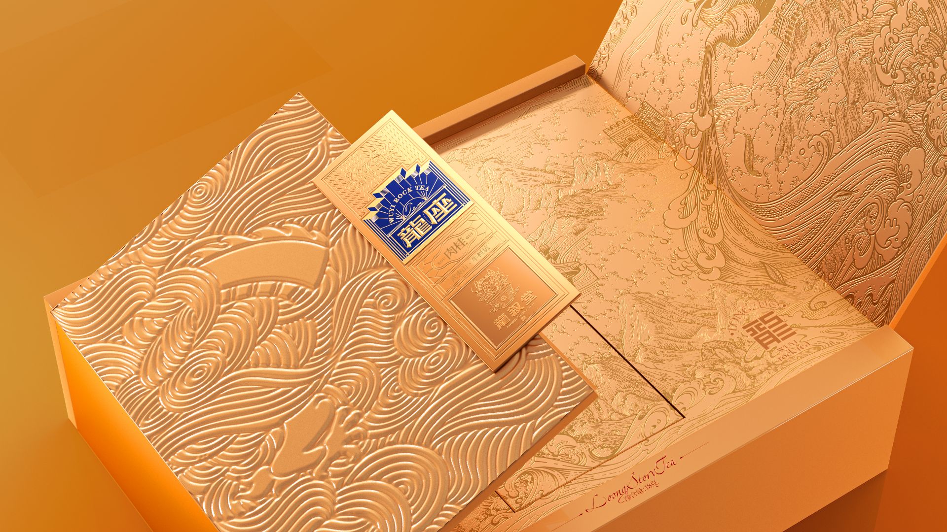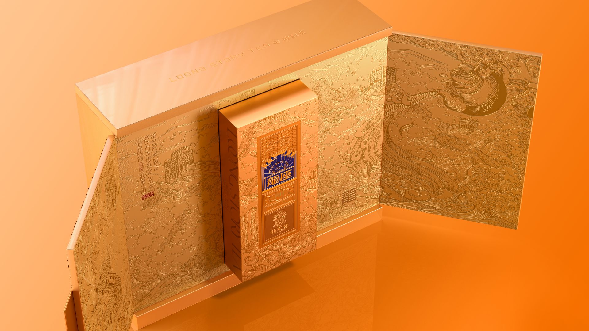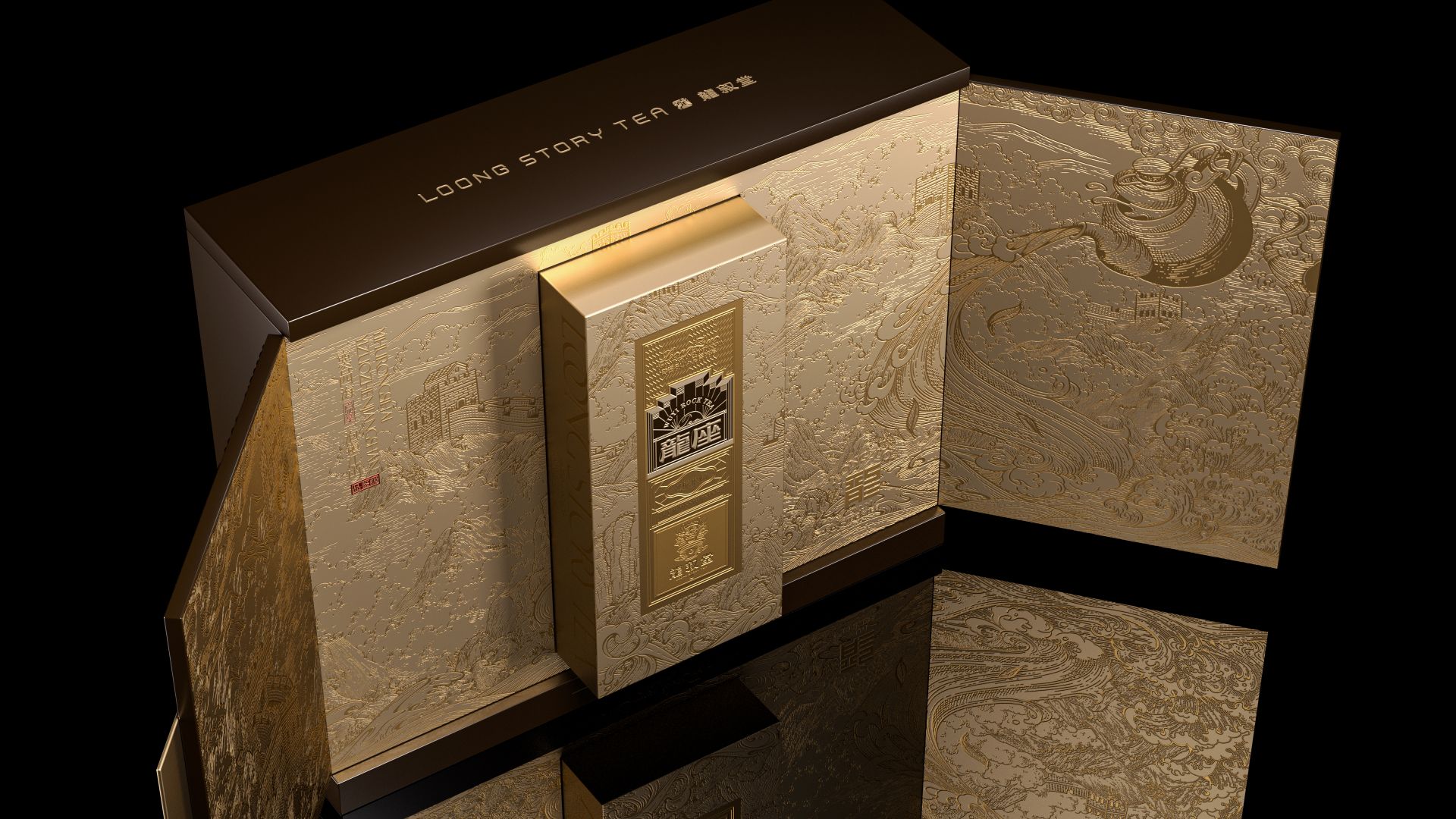 名山茶顶奢典范,以雕磨艺术品的精神,来设计一款茶。主标识由龙椅与天阶演变而来,将二者融而为一,加入现代化的几何演绎,便是龙座能够一眼区分的产品标识。围绕着主标识徐徐展开的,是礼盒封面的底纹。我们以传统文化中的“意会”手法,掩映起真龙的身姿,只在云雾之间,若隐若现。正如古语所说“神龙前首不见尾”,藏于云雾间的真龙,也恰如武夷岩茶神秘莫测、耐人品评。
